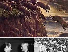 - 지도자를 따라 집단자살하는 레밍. 그림.
